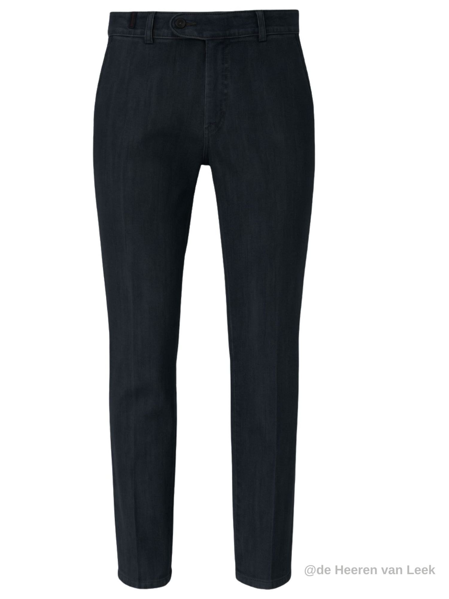 Deze pantalon is gemaakt van een effen katoenen stof met een heel klein beetje stretch. Het is een model met steekzakken. Aan de achterkant zijn twee gepaspelde zakken met knoop. Dit model broek wordt ook wel een chino genoemd. Deze broek is zowel sportief als voor wat nettere gelegenheden te gebruiken.
