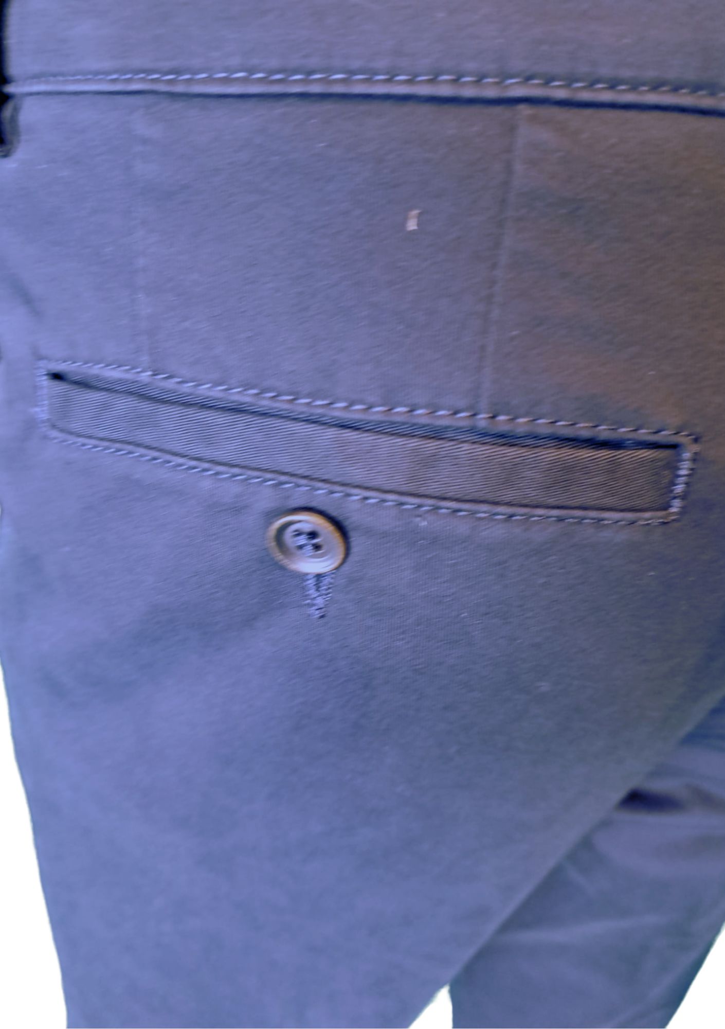 Deze pantalon van San Siro in chino model is een broek die bijna altijd goed is. Met steekzakken en gepaspeleerde achterzakken kun je spreken van een nette sportieve broek. De kleur is donkerblauw. De eerste foto geeft de kleur goed weer. De detailfoto's lijken blauwer dan dat de kleur in werkelijkheid is. Naast de gewone maten ook ingekocht in kwart- (korte-) maten.