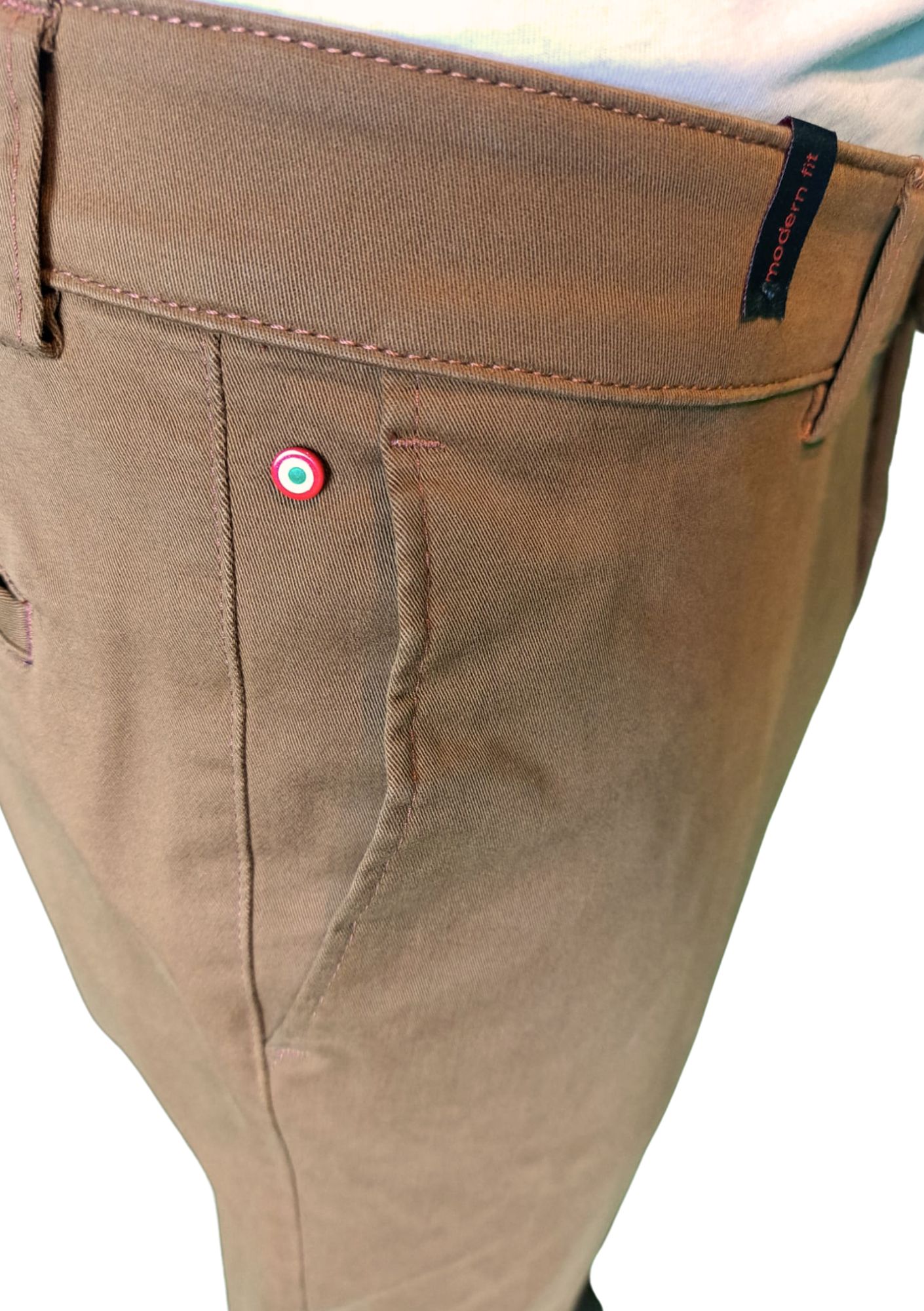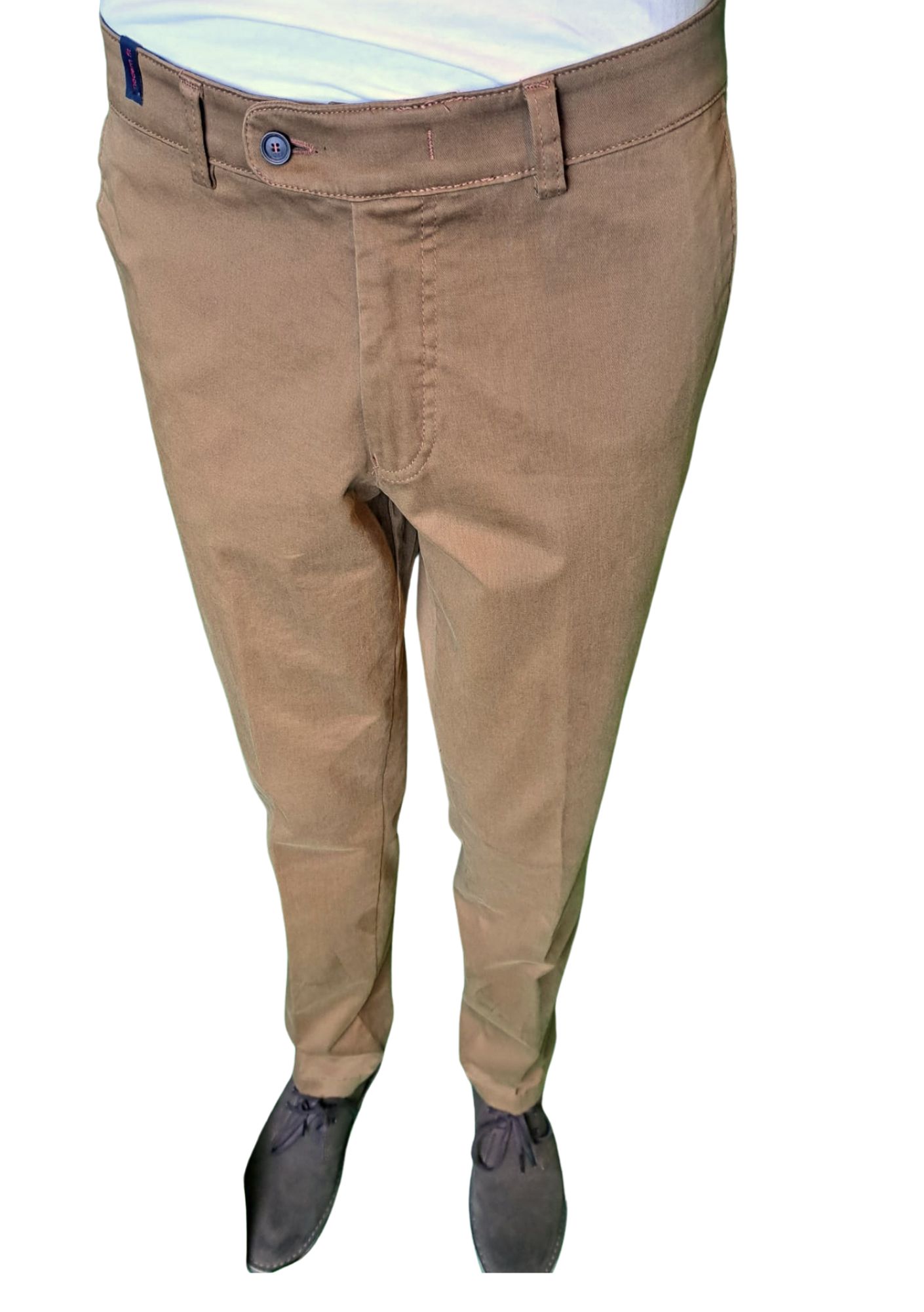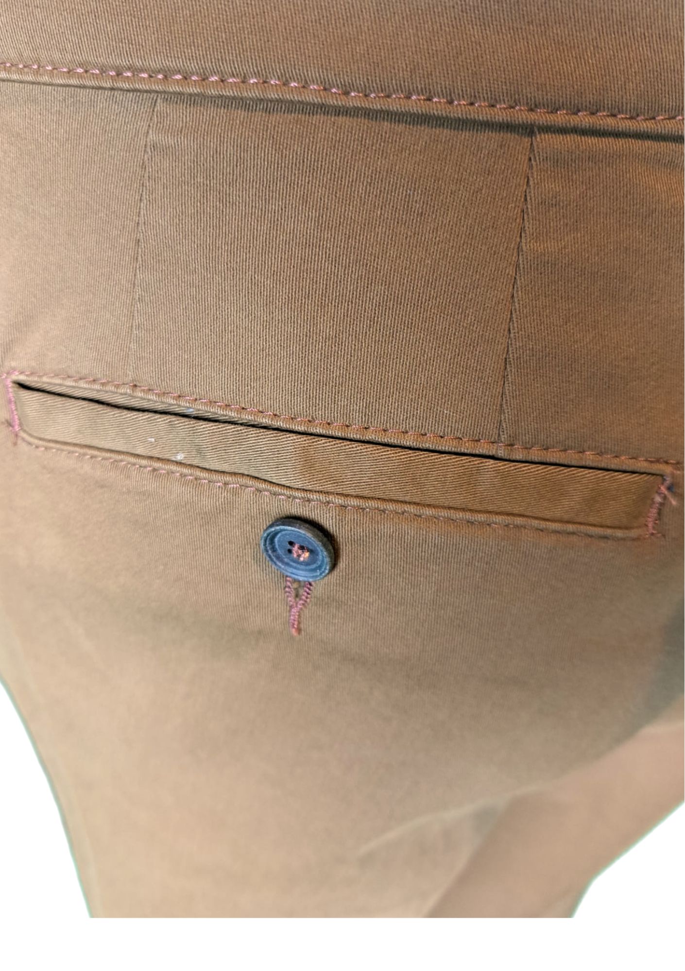 Deze pantalon van San Siro in chino model is een broek die bijna altijd goed is. Met steekzakken en gepaspeleerde achterzakken kun je spreken van een nette sportieve broek. De kleur is zandkleur met een warme gloed Naast de gewone maten ook ingekocht in kwart- (korte-) maten.