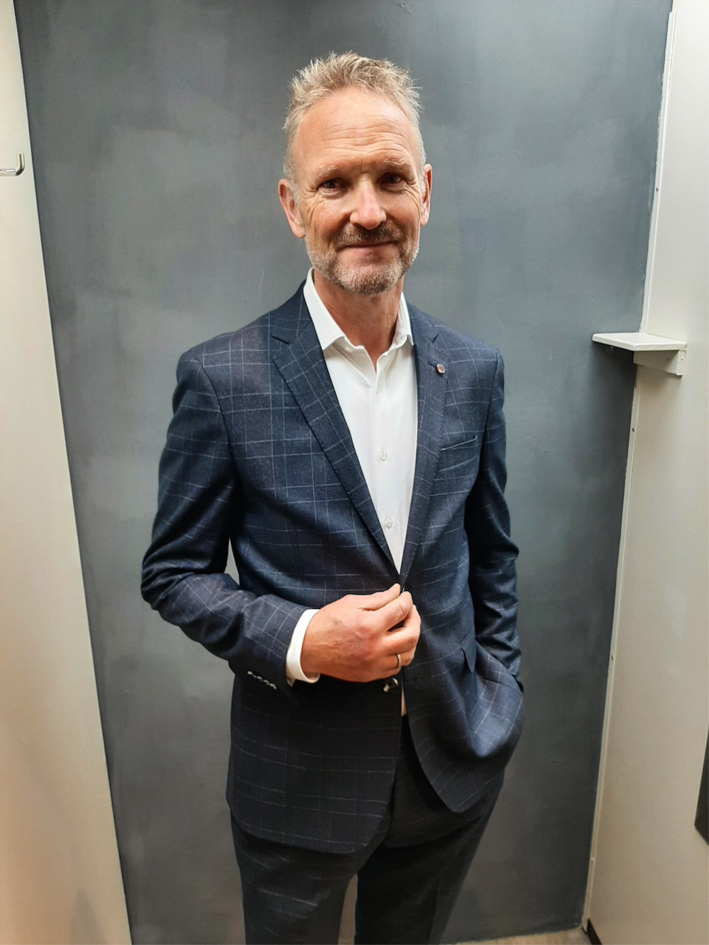 | Omschrijving | Slank gesneden kostuum en donkerblauw met lichtgrijze ruit. |