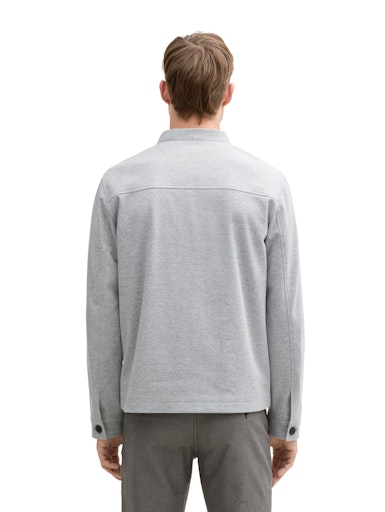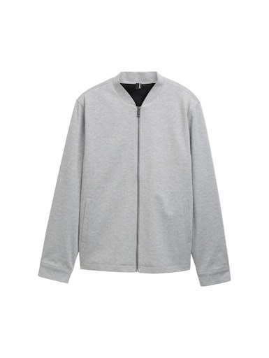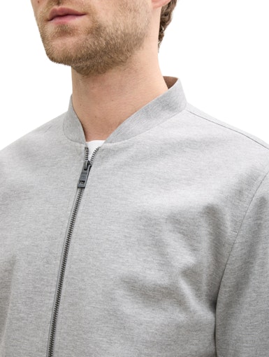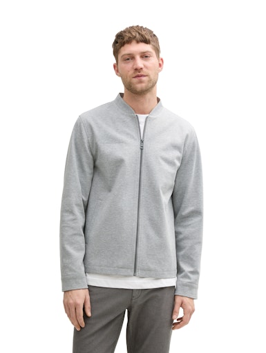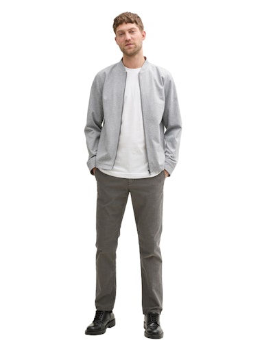 Dit model jasje wordt ook wel een bomberjacket genoemd. Door de grijze pique stof en de voering valt het mooi zwaar en kan het jasje ook heel goed als alternatief voor een colbert worden gebruikt. Je zou er zelfs een soort van eigentijds kostuum van kunnen maken, want we hebben ook broeken in hetzelfde materiaal.