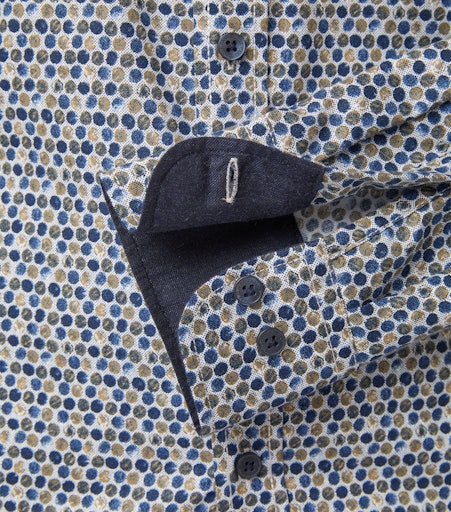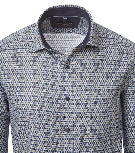 Dit overhemd van casa Moda heeft een kent kraag en een borstzak. Het patroon is blauw met beige bruin tinten. Het overhemd valt niet heel strak.