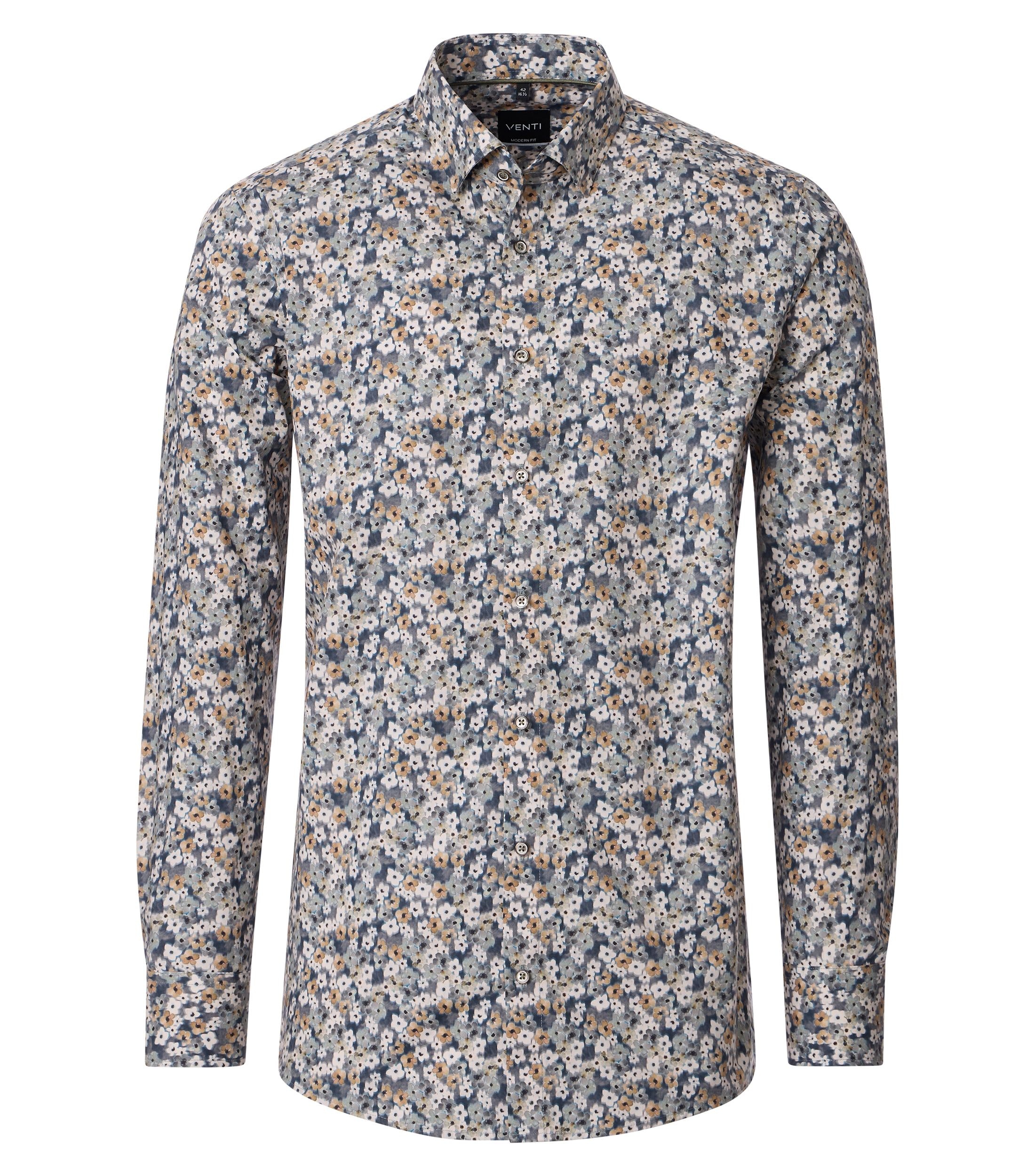 Dit overhemd van Venti heeft een bloemenprint van diverse kleuren en past hierdoor perfect bij een jeans, zandkleur, en blauw. Dit shirt heeft lange mouw, een button down kraag.