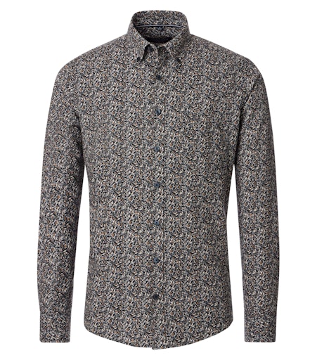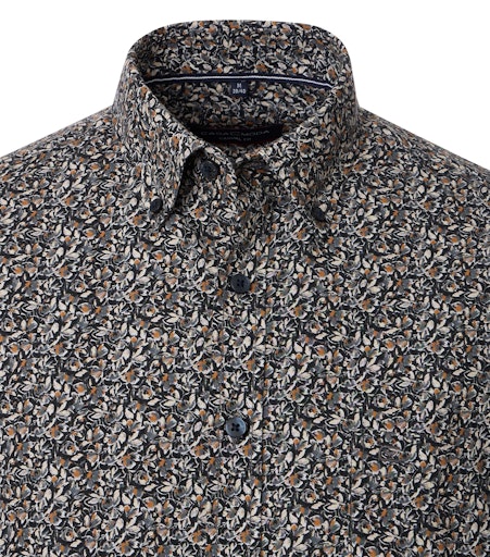 Dit ruimvallende overhemd van Casa Moda heeft een bloemrmotiefje in de tinten groen, oker en beige op een antraciet ondergrond. Het overhemd is door de kleurstelling heel gemakkelijk te combineren.