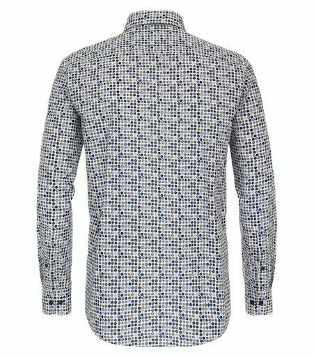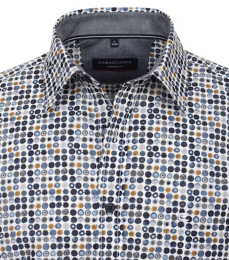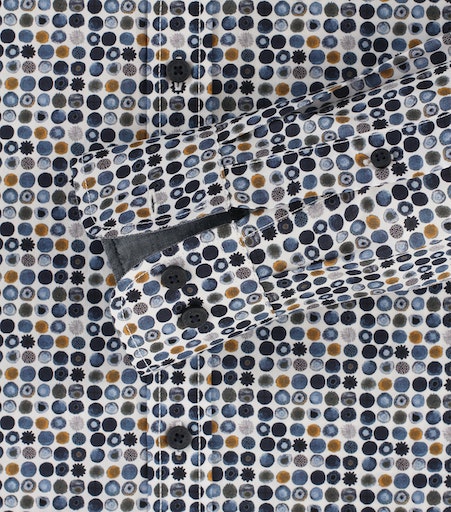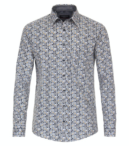 De print op dit overhemd is bijna een klassieker. Dat is niet zonder reden want het motief en de kleuren matchen heel goed bij blauw en zand.