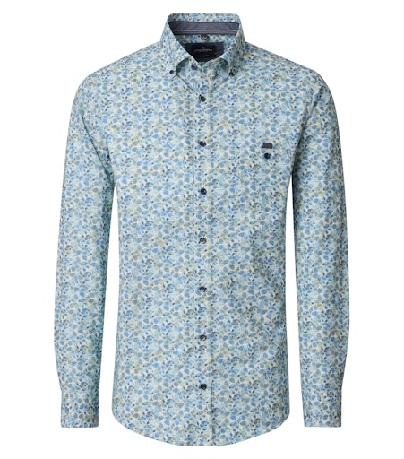 Dit overhemd is uitgevoerd met een button-down kraag en een borstzak, en heeft een fris motief in helder blauw en groen. De kleuren zijn levendig, zonder overheersend te zijn, waardoor het overhemd opvalt op een rustige manier.