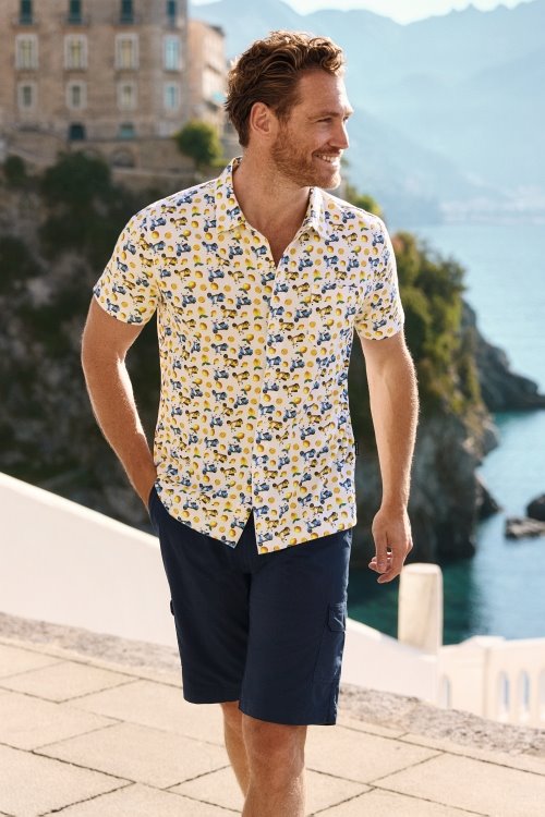 Wat dit shirt bijzonder maakt, is de zomerse bedrukking met scootertjes en citroenen in frisse, zonnige kleuren. Een speels dessin dat direct opvalt zonder overdreven te zijn – de zomer spat er vanaf.