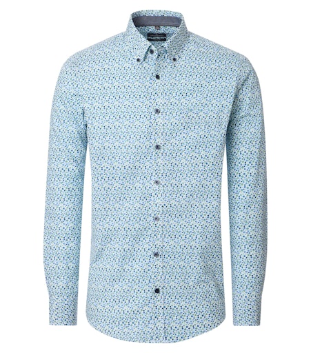 Dit overhemd is uitgevoerd met een button-down kraag en heeft een motief in helder blauw en groen. De kleuren zijn fris en duidelijk aanwezig, maar overheersen niet waardoor het een goed draagbaar shirt is.