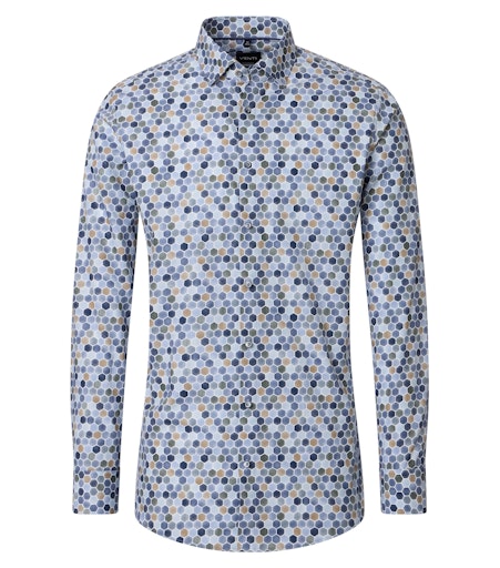 Het overhemd is uitgevoerd in een modern hexagonpatroon in zachte blauwtinten, grijs en zandkleur. Dit geometrische patroon geeft het shirt een eigentijdse en frisse uitstraling, zonder te druk te worden, waardoor het makkelijk te combineren is.