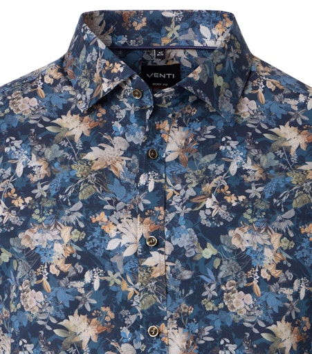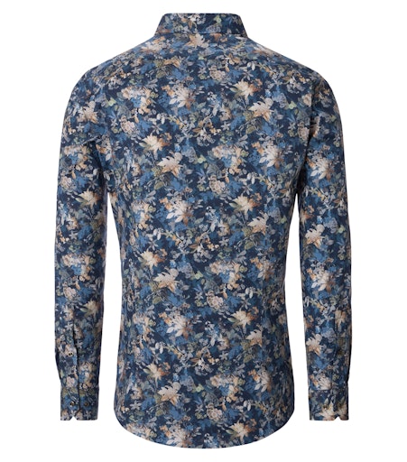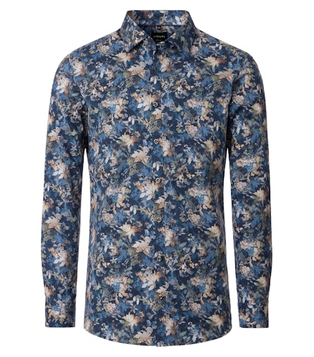 Het dessin bestaat uit een bloempatroon in blauw-, beige- en groentinten. De vele kleuren zijn goed op elkaar afgestemd, waardoor het overhemdmakkelijk te combineren is. Dit maakt het shirt zeer geschikt om te dragen op veel kleuren chino's en ook mooi onder een overhemdjasje of colbert.