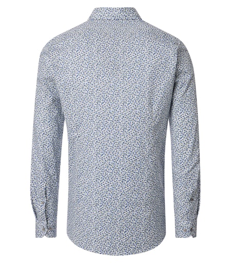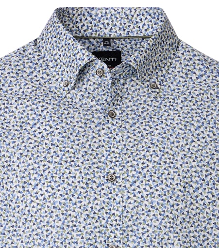 Het overhemd heeft een button-down kraag en is uitgevoerd zonder borstzak. Het dessin bestaat uit heel kleine driehoekjes in groen- en blauwtinten op een witte ondergrond. Door de kleuren en het subtiele patroon kan het shirt zowel onder een colbert als op een jeans gedragen worden. Hierdoor is het overhemd geschikt voor dagelijks gebruik, zowel voor werk als in de vrije tijd.