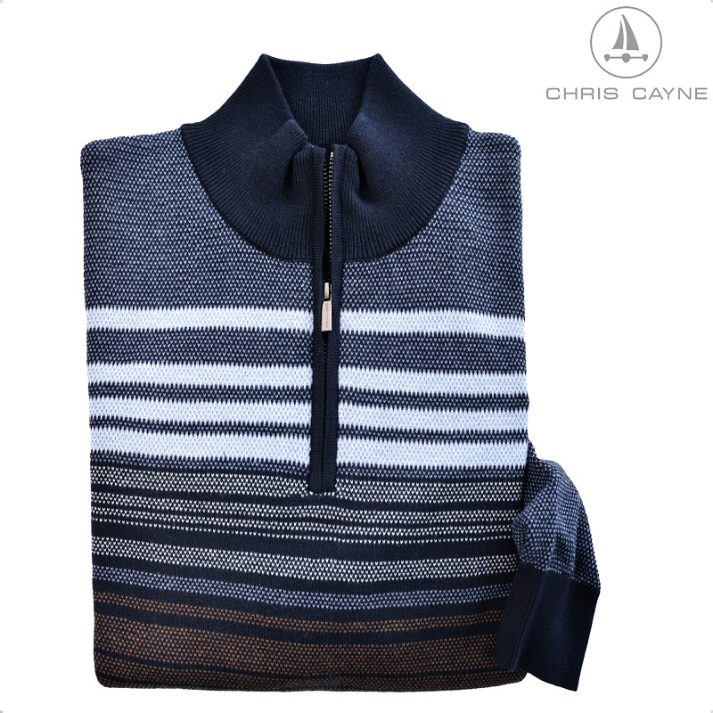 Deze trui met opstaande kraag in blauw tinten en bruin heeft een streeppatroon. Strepen zie je natuurlijk wel vaker maar dit patroon is net even anders, zonder gelijk heel opvallend te zijn. De trui is sportief met een spijkerbroek, maar ook heel goed wat netter te dragen. Met een mooie donkerblauwe broek bijvoorbeeld. De trui heeft boorden bij de taillen en manchetten.