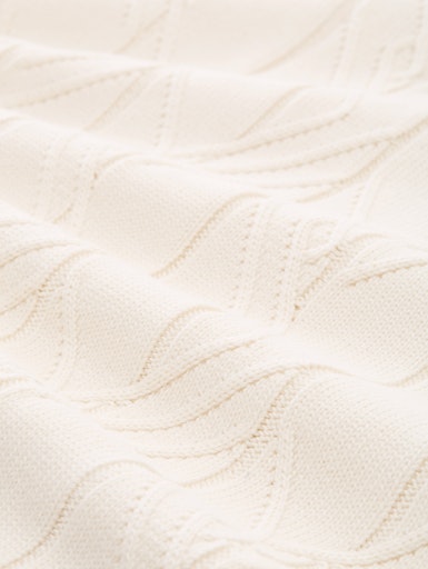 Roomwitte gebreide trui met ronde hals, geribde boorden aan de kraag en zoom en logo-badge op de mouw. Gemaakt van zacht katoen in kabelbreisel. De trui valt recht in een regular fit.